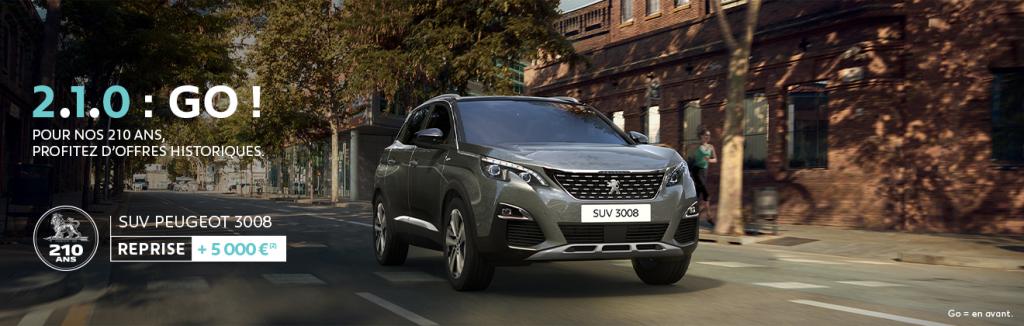 (2) Soit jusqu'à 5 000€ ajoutés à la valeur de reprise de votre véhicule estimée par votre point de vente. Une estimation indicative de votre véhicule est accessible sur le site internet Reprise Peugeot. Le véhicule repris doit être d’une puissance réelle inférieure ou égale à celle du véhicule neuf acheté. Offre réservée aux particuliers, valable du 25/08/2020 au 31/10/2020 pour toute commande d’un SUV 3008 GT BlueHDi 180 EAT8 peinture métallisée neuf hors motorisation hybride, passée avant le 31/10/2020 et livrée avant le 31/12/2020 dans le réseau PEUGEOT participant. Offre non valable pour les véhicules au prix Peugeot Webstore et les véhicules sur le site store.peugeot.fr.